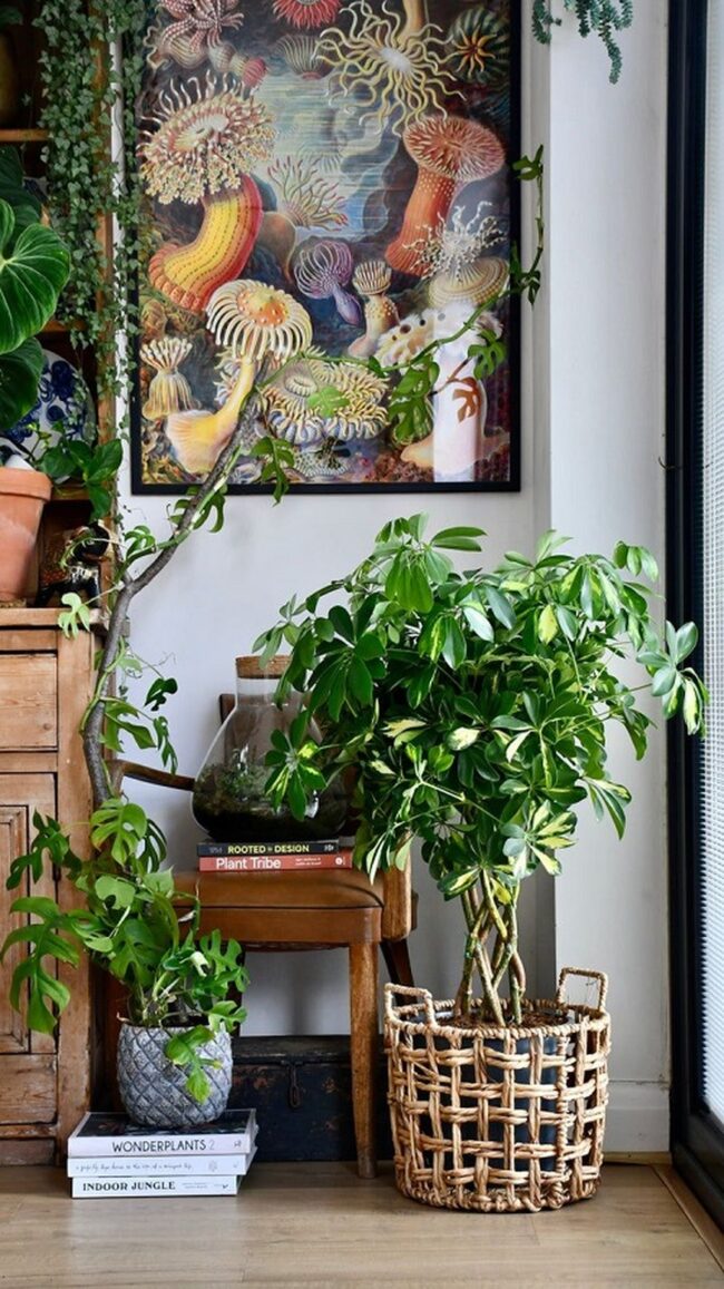 Tropical vibes emerge from each carefully cultivated schefflera bonsai, bringing natural elegance to home decor spaces.