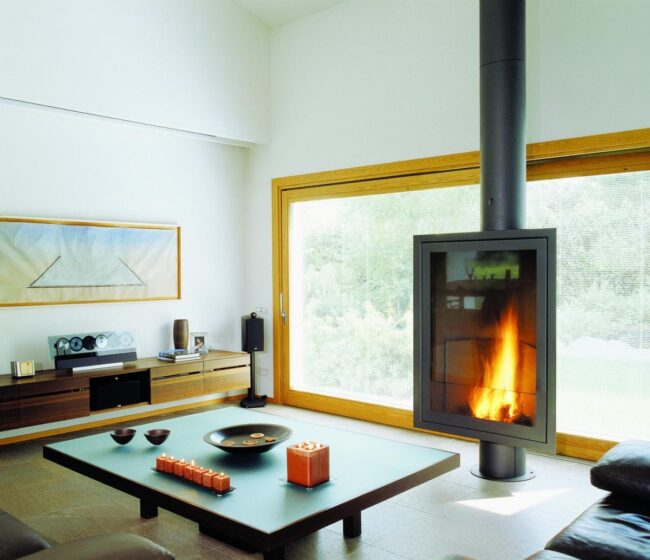 A unique, slightly eccentric addition to any one-of-a-kind home, this modern fireplace idea stands out like a submarine’s periscope.
