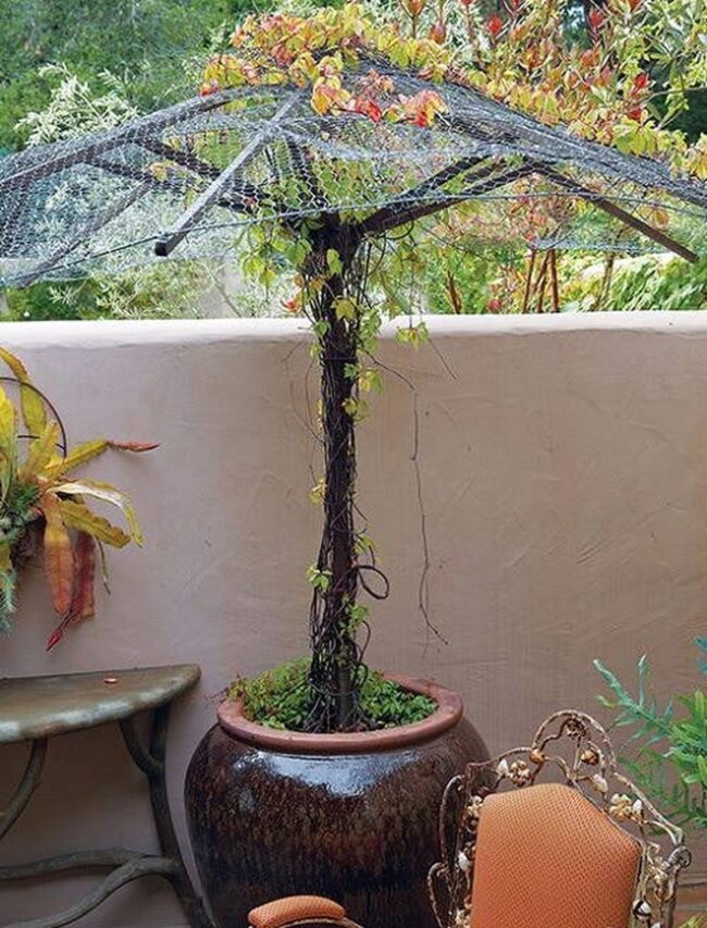Patio umbrellas with their sturdy frames become unexpected vertical gardens that look unique and functional.