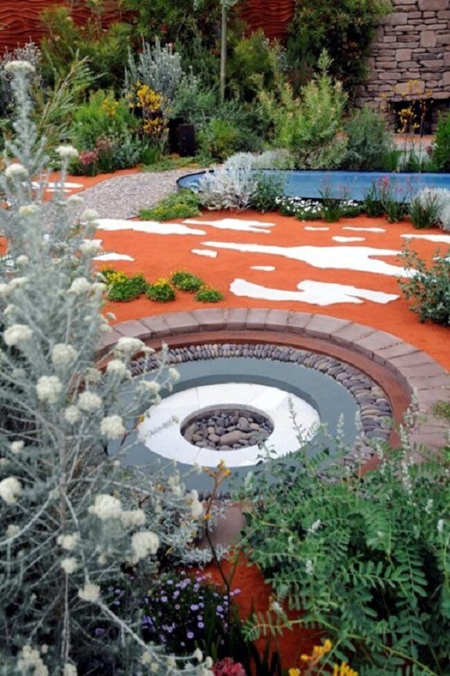 Garden designers sprinkle dyed sand around landscape features to create visual interest and depth.