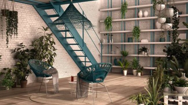 Plant shelves against blue staircases energize indoor spaces with dramatic green contrasts and vertical gardening potential.