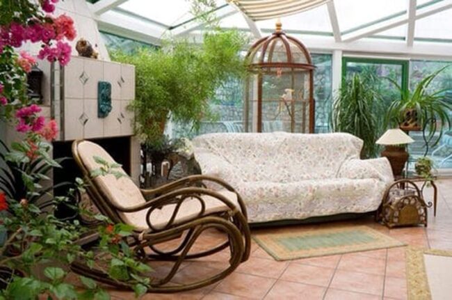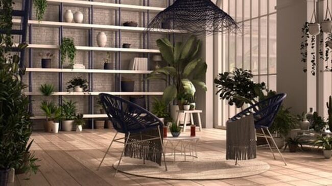 Comfortable seating arrangements near potted greenery encourage peaceful moments of contemplation and connection with nature.