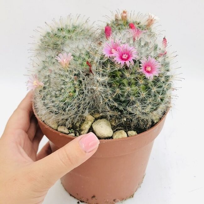Powder puff cactus are delightful compact spheres covered in silky white spines that burst with adorable pink flowers.