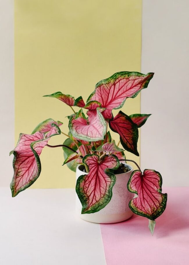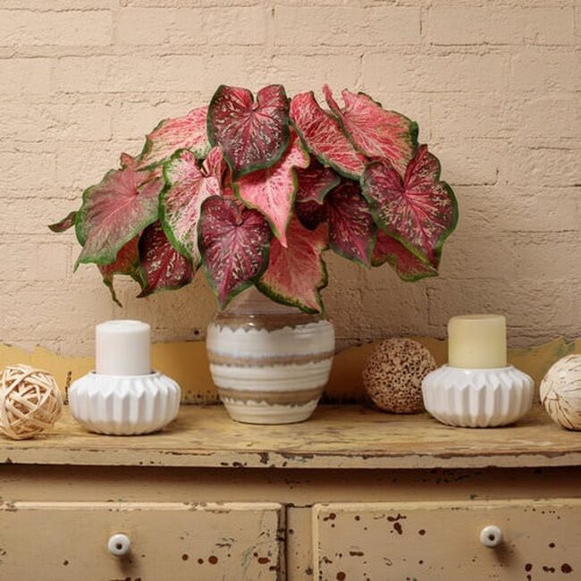 Blushing bride caladiums radiate pure elegance with their enchanting rose-pink heart-shaped leaves.