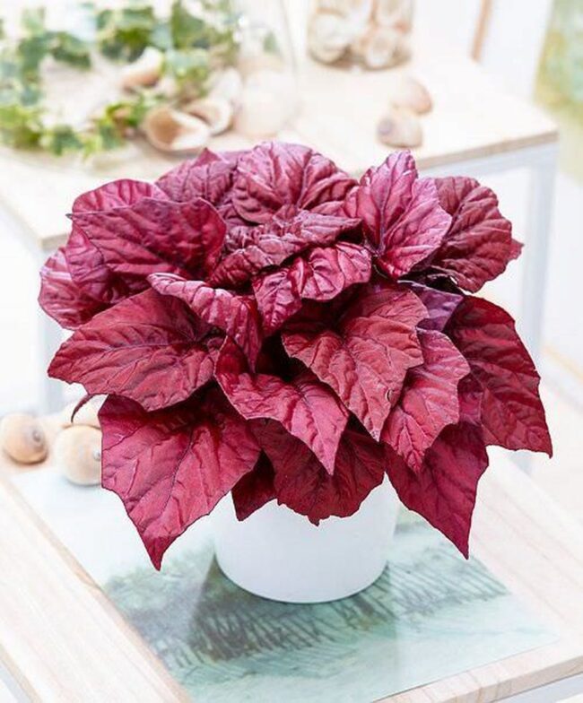 Spitfire rex begonia radiates dramatic indoor drama with its intense red-pink heart-shaped leaves edged in silver and green.