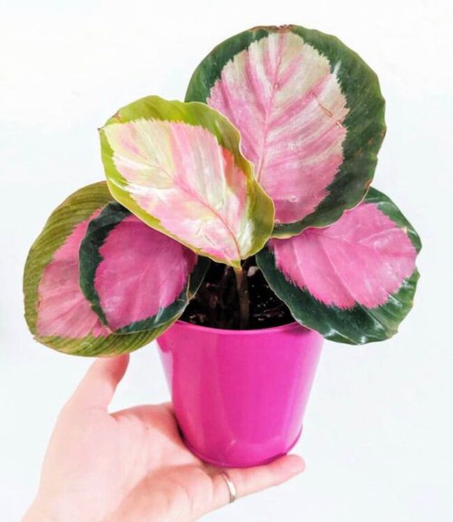 Delicate pink centers pop against rich green boundaries, making Calathea Rosey a stunning addition to indoor spaces.