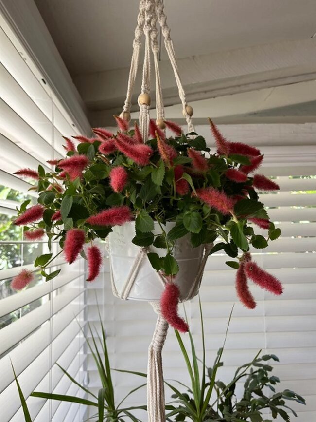 Chenille plant cascades with dramatic red furry tassels measuring up to 18 inches long, making indoor spaces feel instantly lush and exotic.