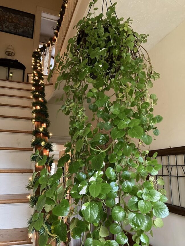 Delicate heart-shaped leaves trail gracefully from hanging baskets and shelves.