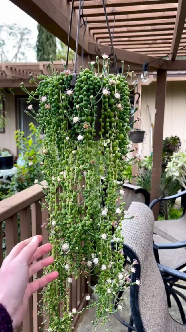 String of pearls is a cascading succulent that brings dramatic elegance to indoor spaces with its delicate, spherical leaves.