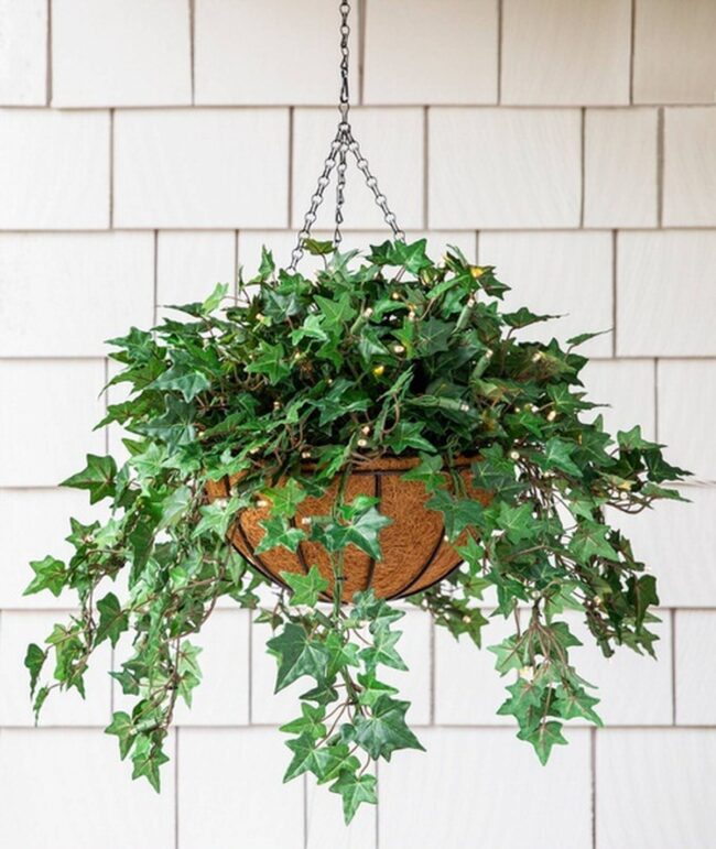 English ivy cascades dramatically from hanging baskets with elegant trailing vines that soften room edges.