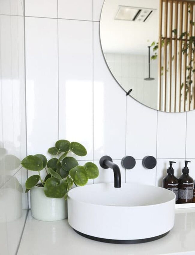 Dark green leaves provide rich color contrast against white bathroom surfaces.