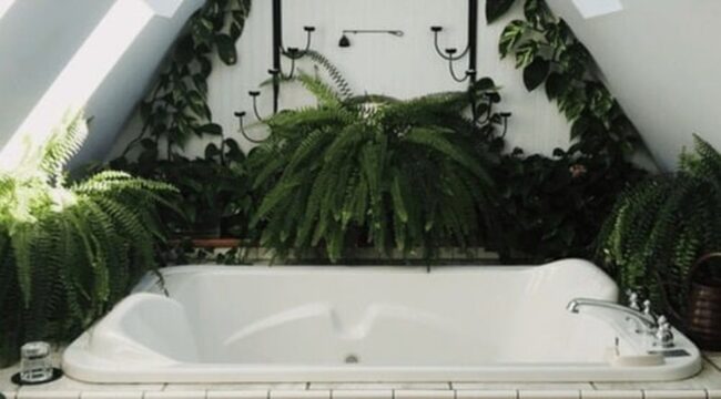 Ferns filter indoor pollutants while adding organic texture to bathroom decor.