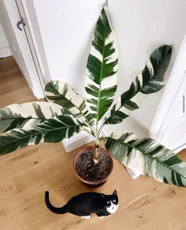 Variegated banana brings exotic drama with massive green-white-cream striped leaves perfect for indoor tropical landscapes.