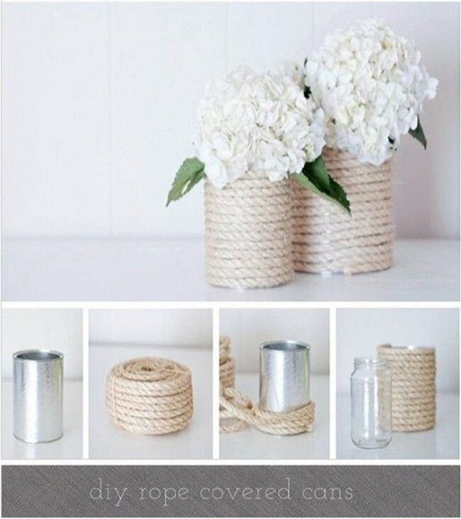 Sturdy rope winds around basic glass jars or plastic bottles, instantly upgrading their appearance with rustic texture.