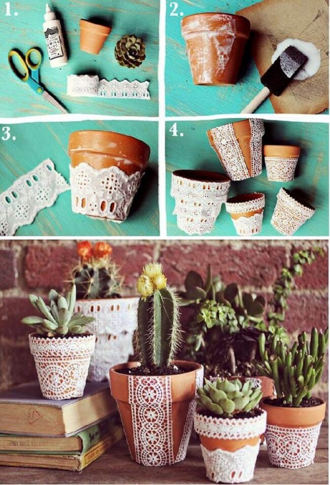 Simple cotton or vintage lace transforms standard clay pots into elegant decorative pieces perfect for herbs, succulents, or flowering plants.