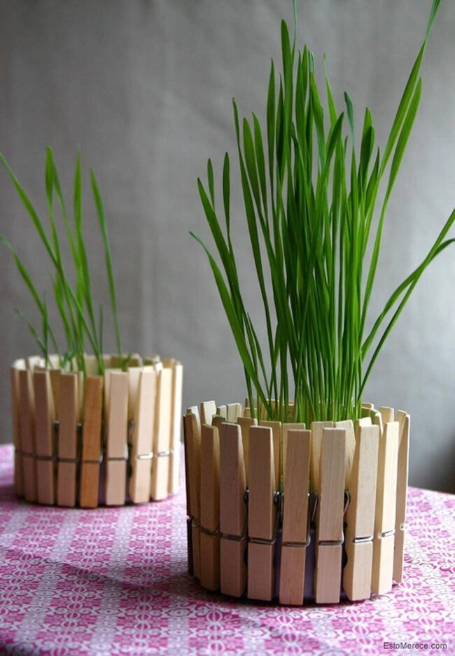 Wooden clothespins become a delightful fence circling your garden pot, creating playful texture and rustic charm.