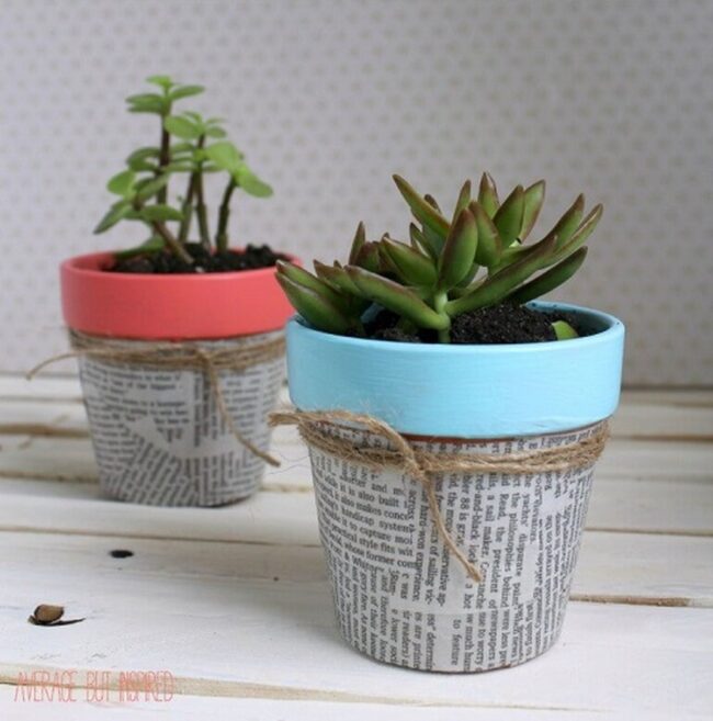 Newsprint succulent pots add charm and personality to garden spaces with unexpected newspaper wrapping techniques.