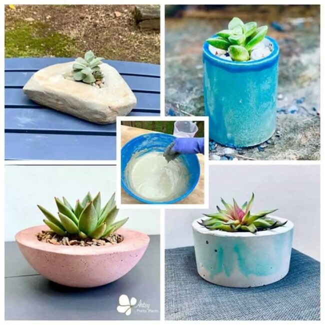 Mixing cement, sand, and water creates smooth surfaces perfect for holding succulents, herbs, or flowering plants.