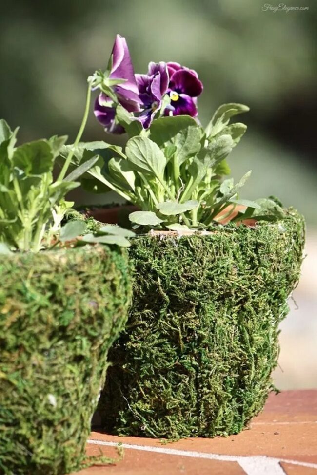 Clay containers become living art pieces when blanketed with delicate green moss.