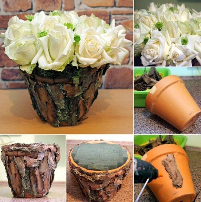 Wood fragments and twigs transform plain containers into rustic garden treasures.
