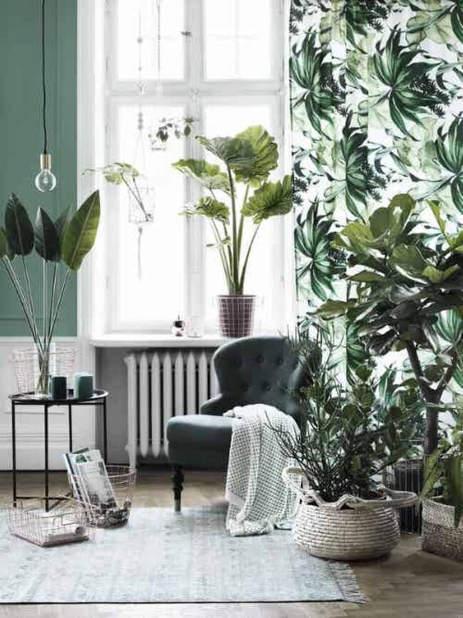 Curtain patterns echoing botanical themes amplify the plant arrangement's visual impact.