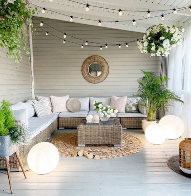Outdoor Lounge with Baskets and Hanging Bulbs