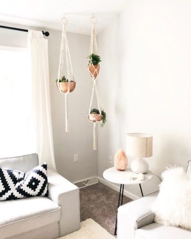 Hanging macrame plant holders elevate small living room designs with bohemian charm and vertical green magic.