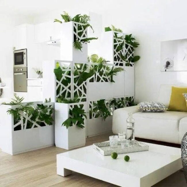 Ficus trees, bamboo plants, and tall snake plants serve as excellent natural room partitions.