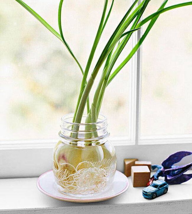 Garlic greens are a quick and easy way to grow fresh herbs indoors without soil.