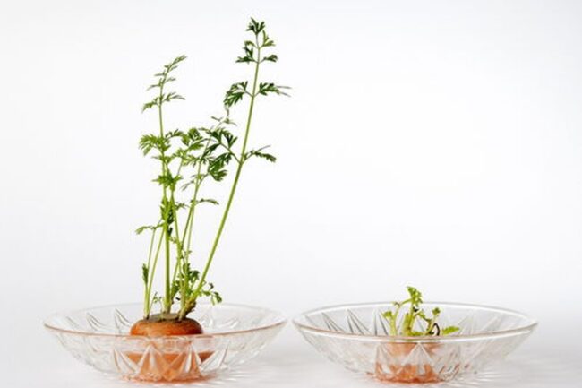 Clean carrot tops with their tiny green stalks work magic in water-based propagation.