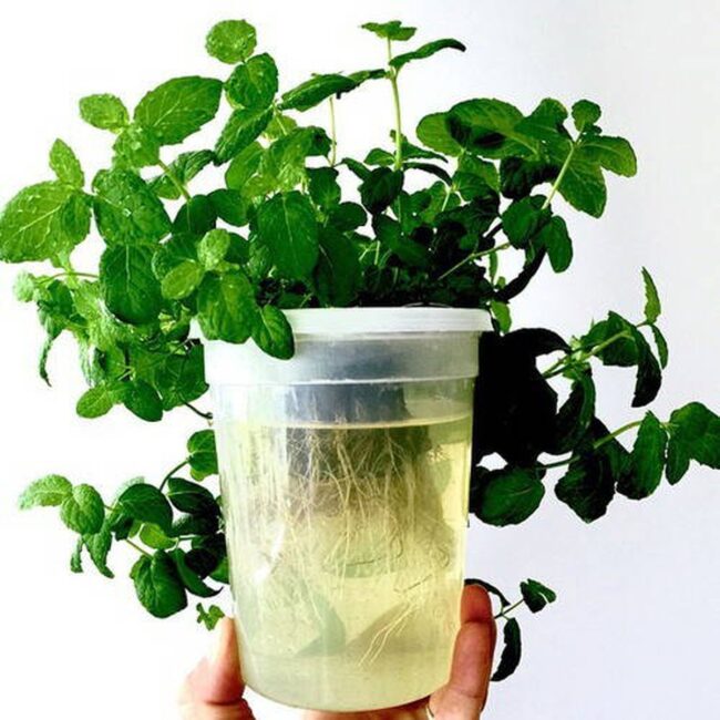 Mint are deliciously easy herbs sprouting roots directly in water containers.