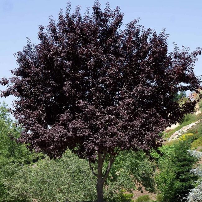Purple leaf plum brings dramatic color contrast to gardens with deep burgundy-purple leaves that shimmer against green landscapes.