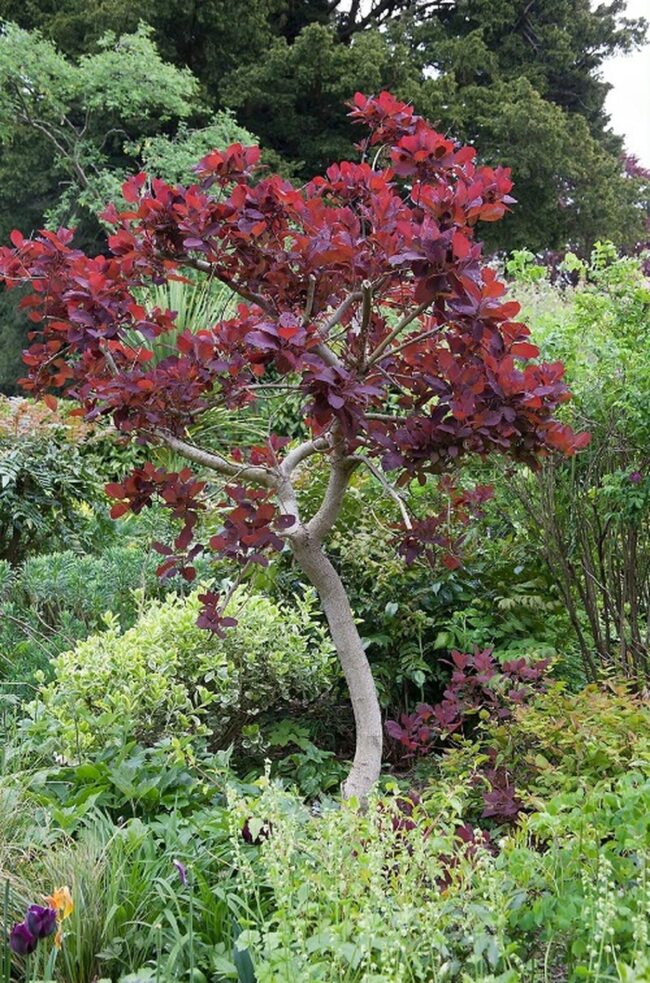 Smoke trees showcase mesmerizing purple foliage that melts into reddish-orange flames during autumn.