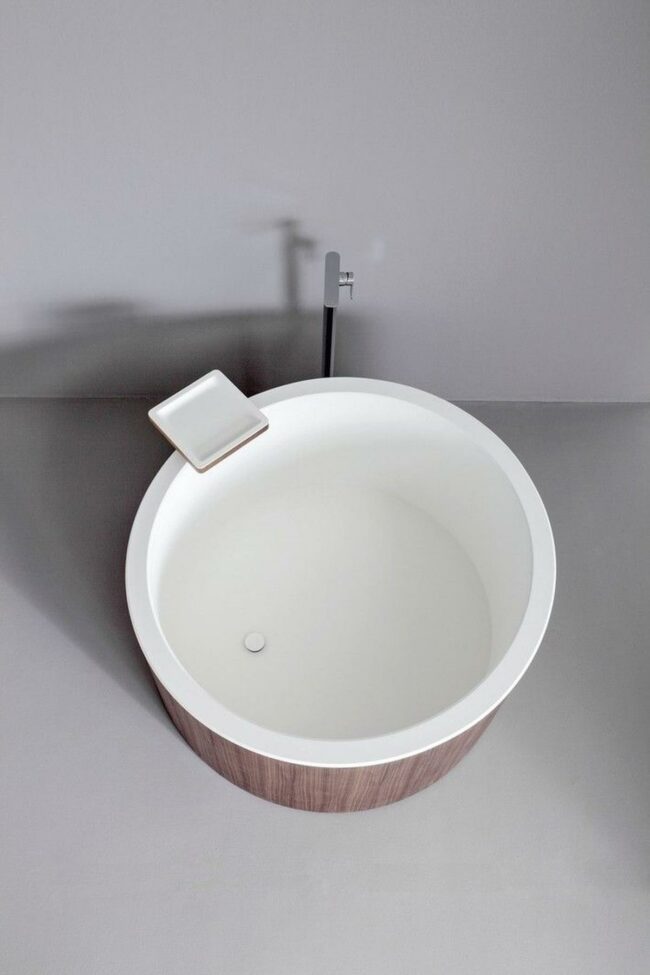 Red round bathtubs make powerful statements in modern bathrooms with their eye-catching color that instantly livens up the space.