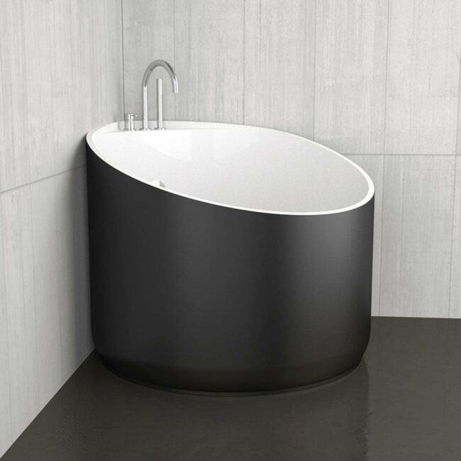 Black and white combine perfectly in this eye-catching bathtub with its smooth, rounded edges that stands out against light gray wall tiles.