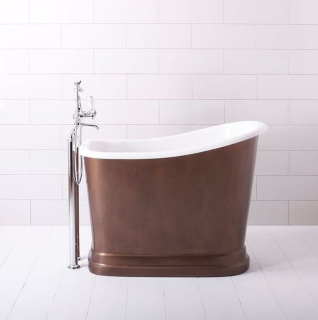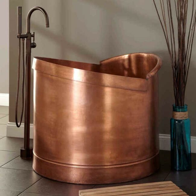 Modern bathrooms deserve a copper tub with its warm, eye-catching glow that stands out against dark floor tiles.