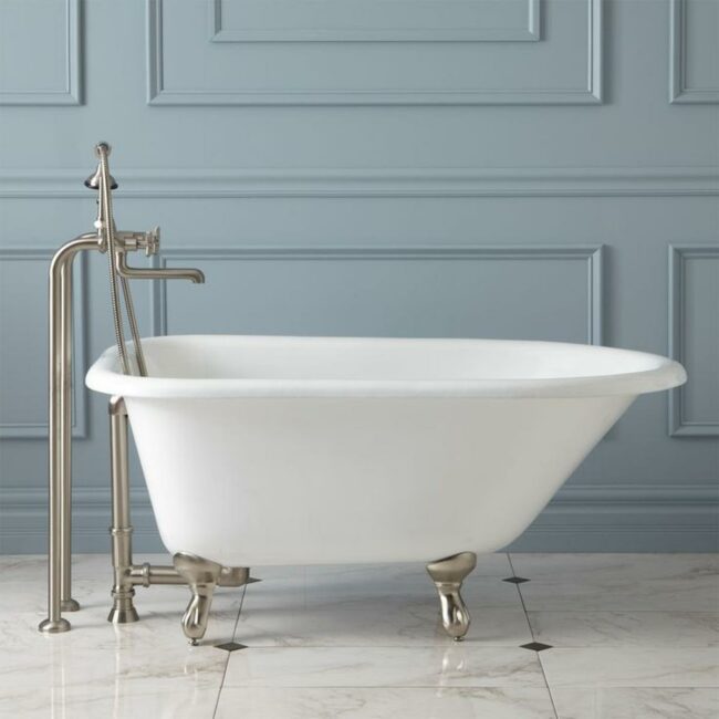 White clawfoot bathtubs add timeless elegance to any bathroom with their graceful curves against soothing light blue walls.