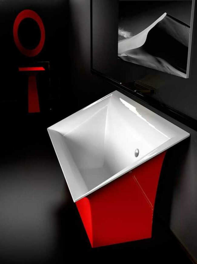 The eye-catching bathtub features a vibrant red base contrasting beautifully with its angular white top, becoming the room's focal point.