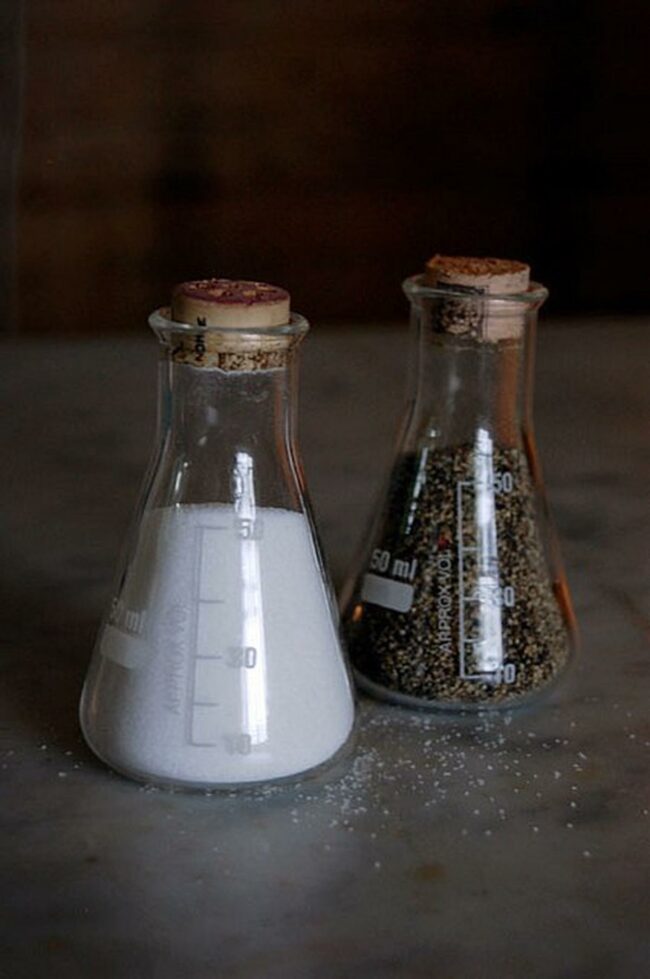 Glass jars with cork tops showcase dark and white seasonings through transparent sides.