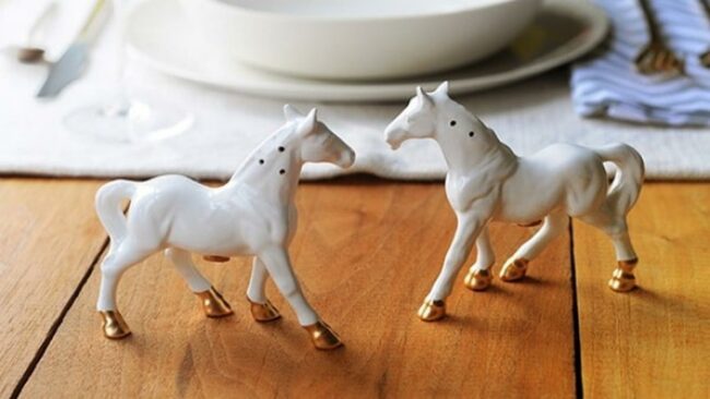 Silver cutlery and white dishes frame the horses, adding elegant structure to the composition.