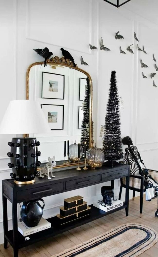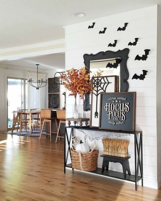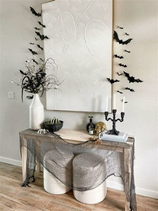 Halloween decor brings magical drama to this moody room, where black bats soar dramatically up crisp white walls.