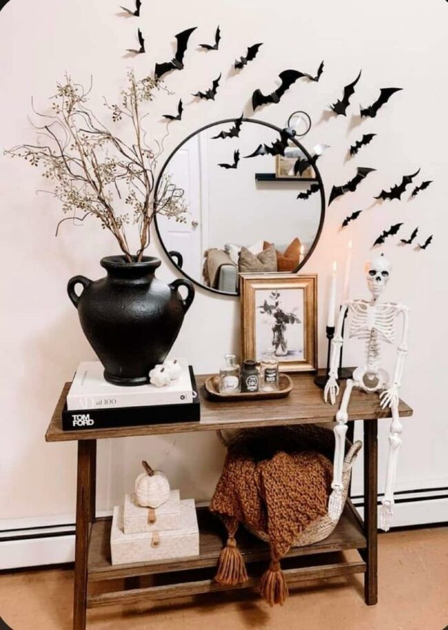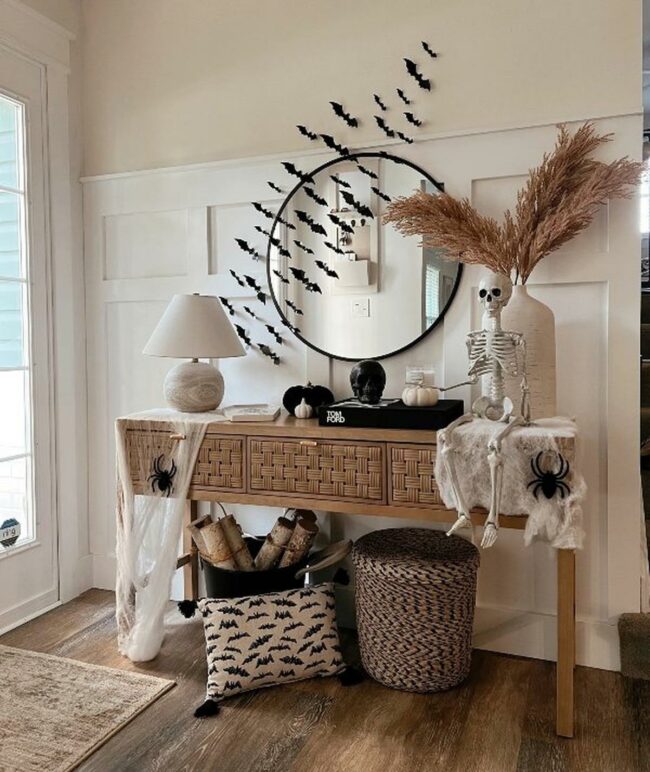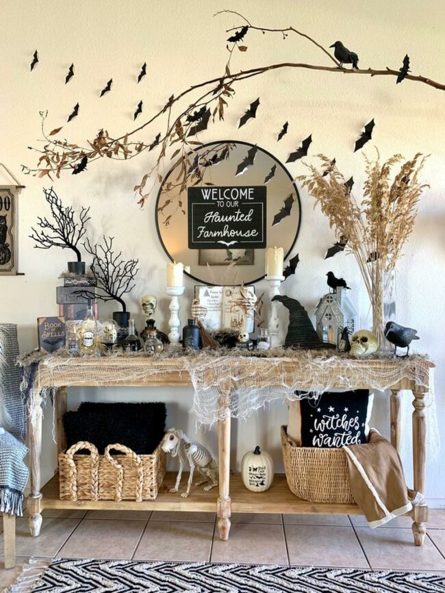 Light wood furniture provides a neutral backdrop that allows spooky accessories to pop dramatically.