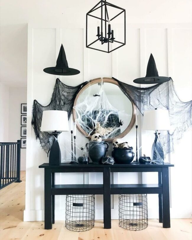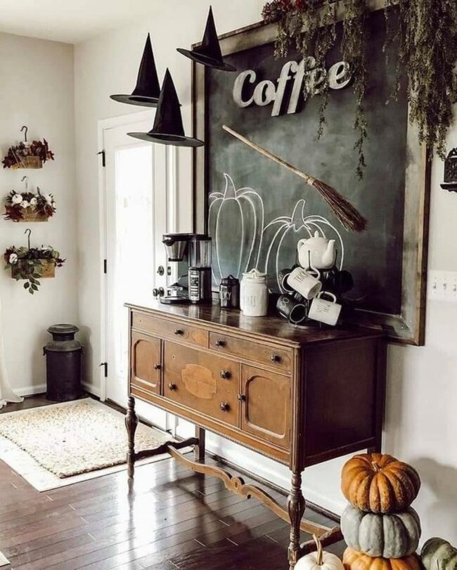 Black witch hats dramatically hang above a classic sideboard, instantly setting a playful mood.