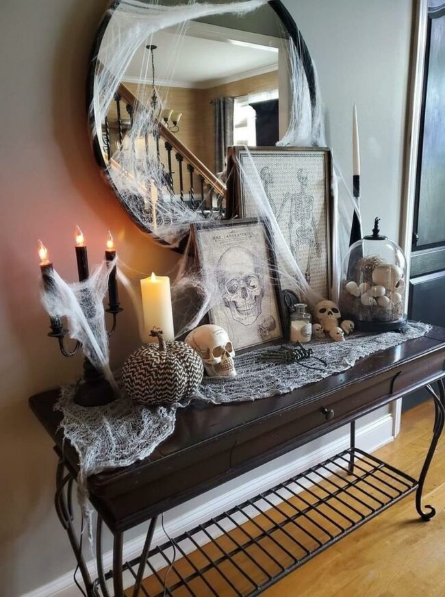 Spooky spider webs drape across mirrors, casting ghostly shadows that send delightful shivers down your spine.