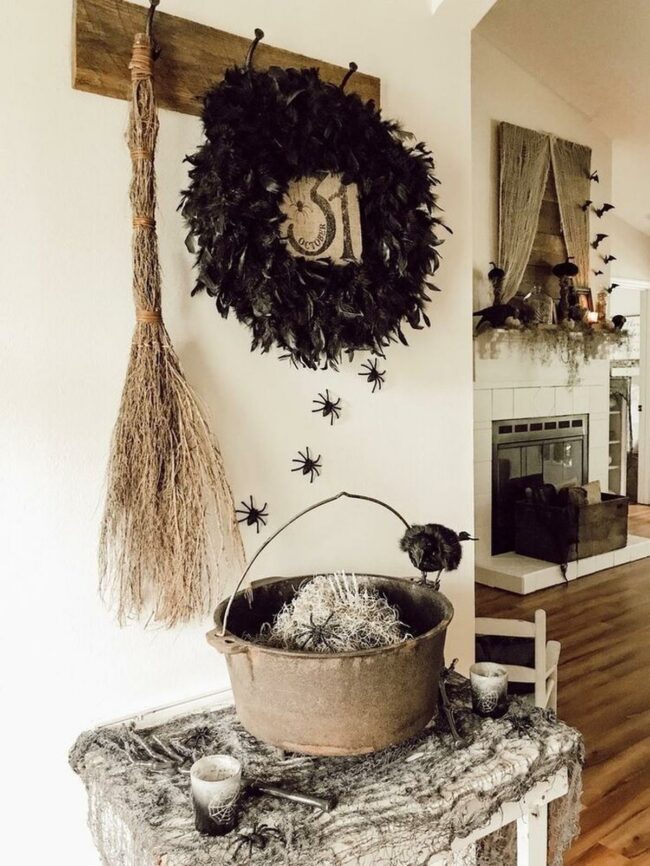 Rustic elements like dried wreaths and mini brooms introduce natural textures that complement the witchy atmosphere.