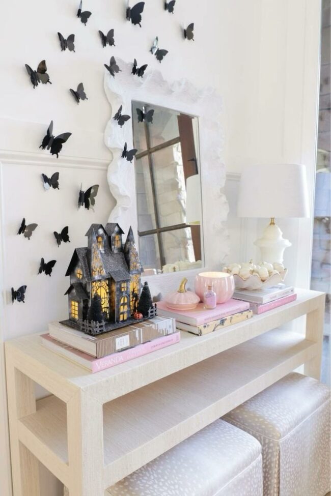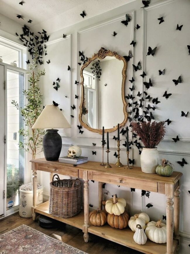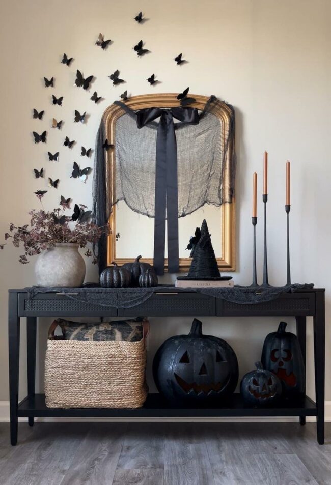 Delicate black butterflies flutter playfully up the wall, creating visual movement near a large gold-framed mirror draped with sheer black ribbons.