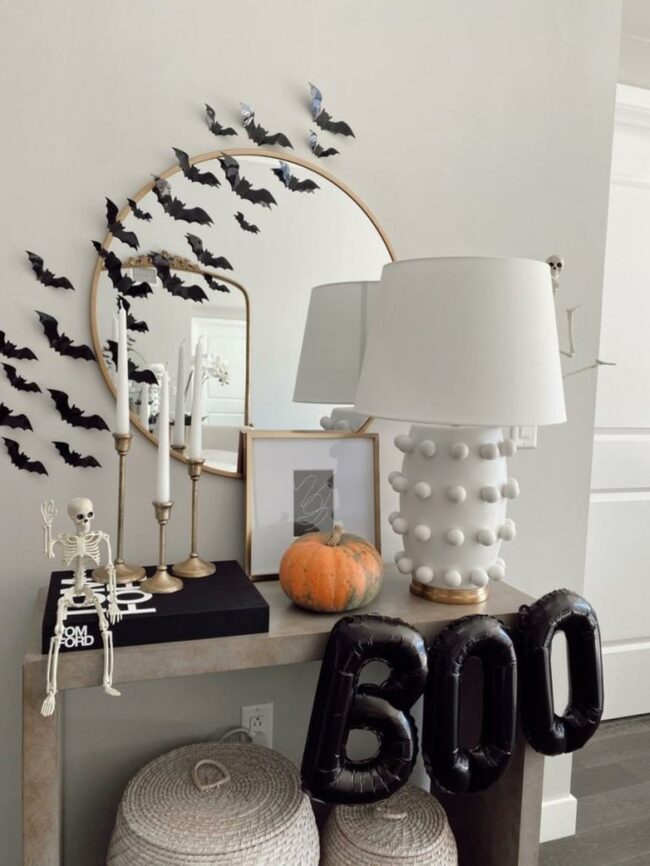 Black paper bats climb the wall, adding whimsical spirit without overwhelming the space.