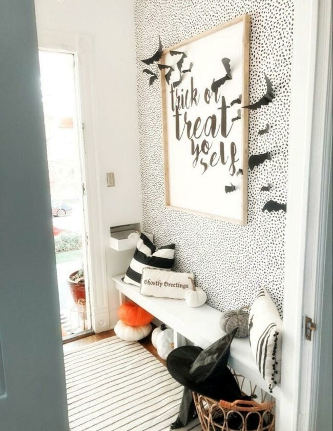 Black paper bats swoop playfully around a framed "trick or treat yo self" sign, creating whimsical movement across white walls dotted with tiny black speckles.