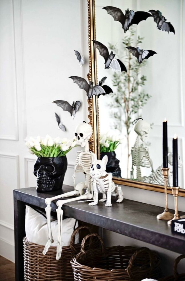 Small decorative touches make the space feel intentionally haunting, with a striped skeleton sitting casually on a chair adding playful personality.
