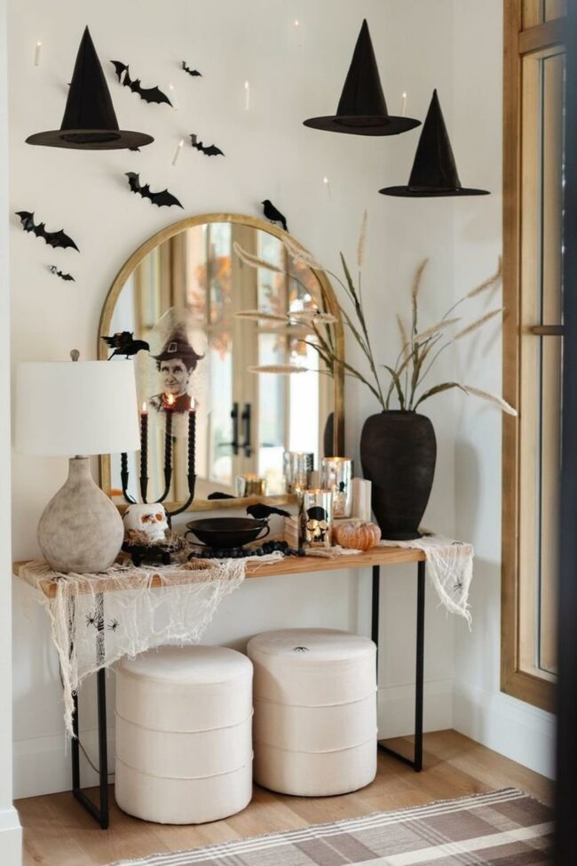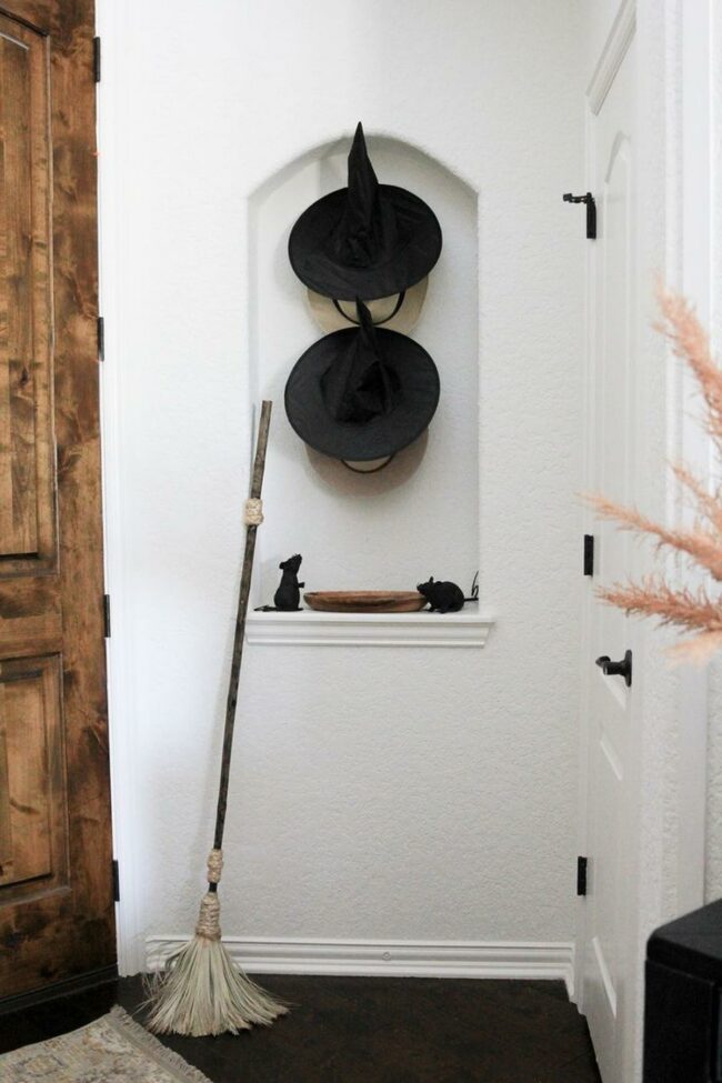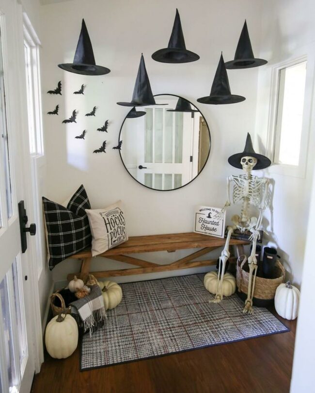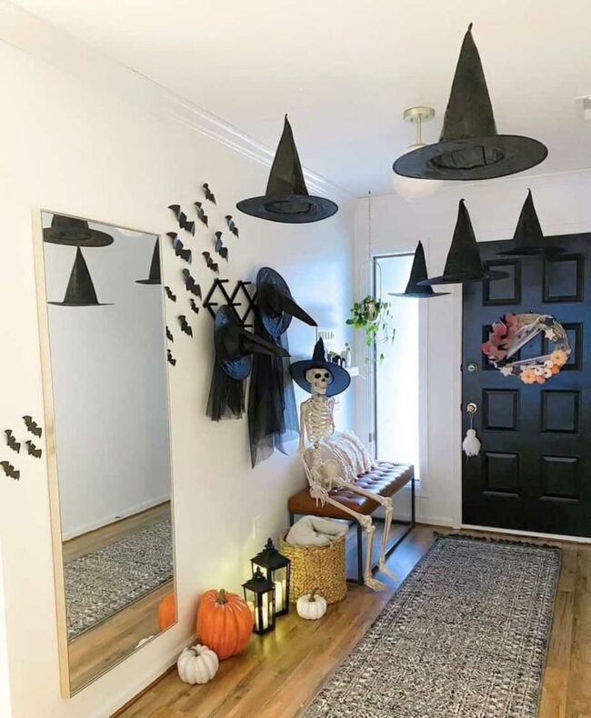 Halloween decor creates a playful, spooky atmosphere with black witch hats adorning the white wall.